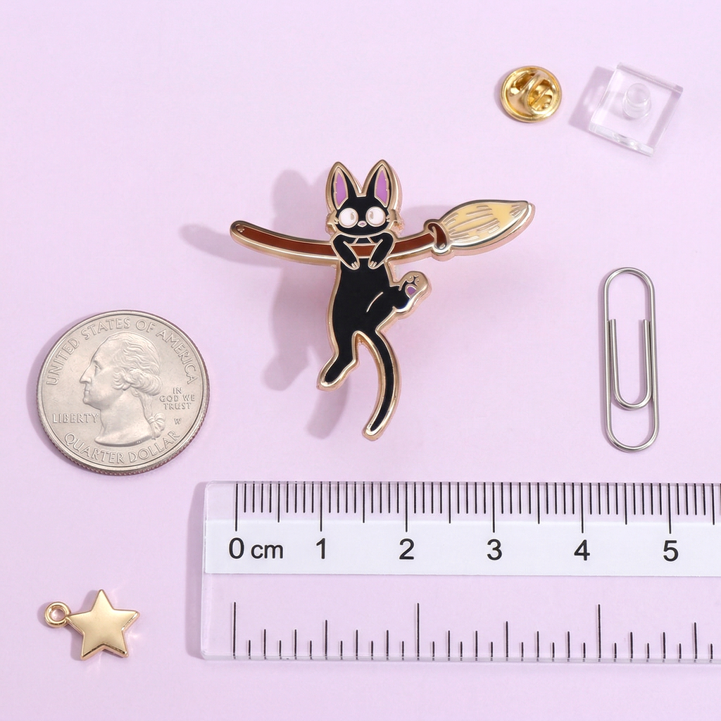 Let the mischievous Jiji steal the show as he hangs from a broomstick in this adorable enamel pin! 🧹✨ Capturing Jiji's playful essence, this pin is a must-have for any Studio Ghibli fan who wants to carry a piece of the magical world of Kiki's Delivery Service wherever they go.