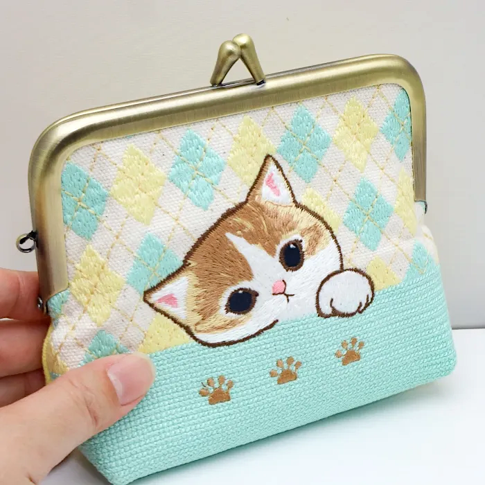 Tuck away your tiny treasures in the utterly charming Mofusand Kiss-Lock Purse! This compact, vintage-style coin purse is a must-have accessory for fans of the adorable, fluffy cat. The exterior boasts a warm, high-quality embroidery design featuring the Mofusand kitty peeking out against a playful mint and argyle backdrop. The classic kiss-lock (clasp) closure provides a secure, satisfying snap! to keep your essentials safe. Itโ€™s perfect for organizing coins, chapstick, hair clips, or any small essentials in the cutest way possible!