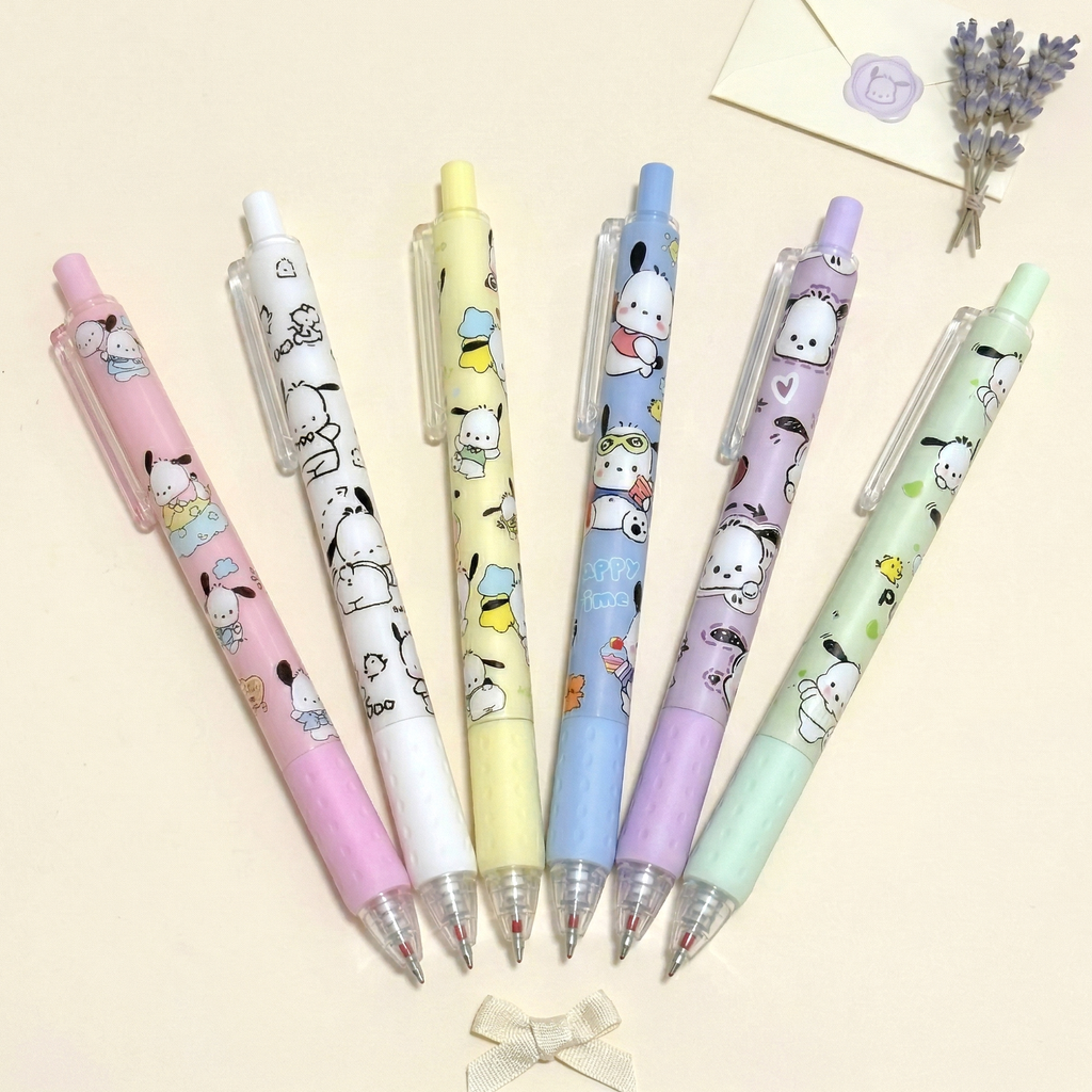 Make every writing moment irresistibly cute with the Pochacco Puppy Gel Pens! Featuring 6 playful barrel designs, each pen is adorned with charming doodles of everyone’s favorite sporty pup—Pochacco! With smooth black ink, a 0.5 mm tip, and a soft grip for extra comfort, these pens are perfect for notes, journaling, or just adding joy to your day. Clip one onto your notebook or tuck it into your pouch for a dose of cuteness on the go! ✨🖊️