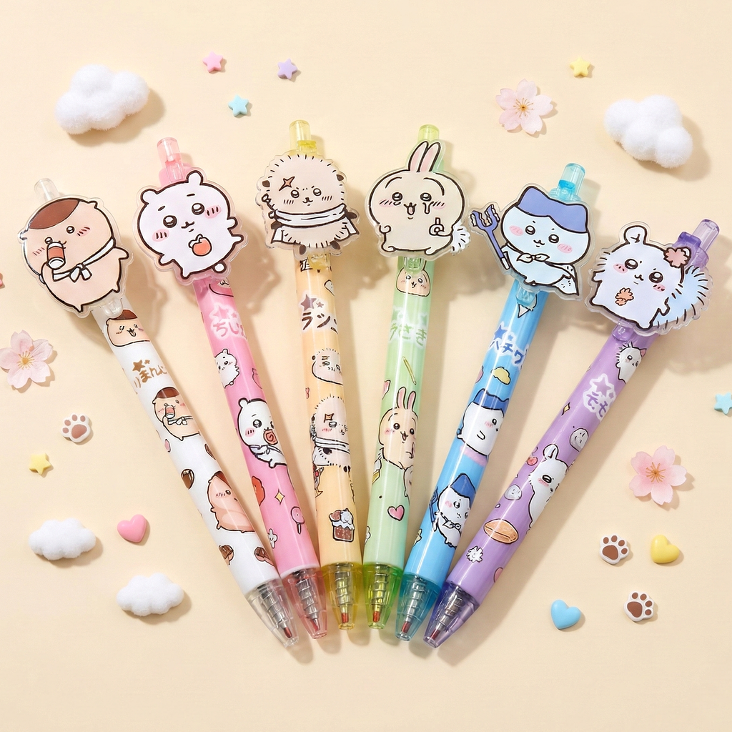 Brighten up your desk with these charming Chiikawa Happy Friends Gel Pens! Featuring vibrant designs of the beloved characters Chiikawa, Hachiware, and Usagi (and more friends, as seen in the images!), these pens combine smooth-flowing black gel ink with ultimate kawaii aesthetics. Each pen has a sweet, colorful barrel design and is topped with a delightful die-cut clip showcasing a different friend, making them a joyful addition to any stationery collection. Perfect for detailed notes, expressive journaling, or adding a playful flair to every doodle! βοΈ