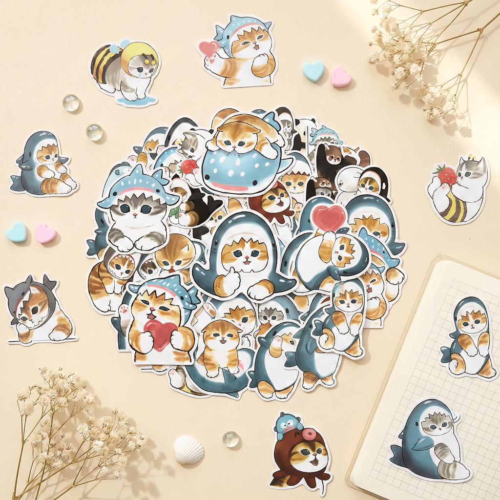 Dive into a world of pure cuteness with this adorable set of 50 mofusand stickers! ๐ These silly kittens are ready for their underwater adventure, dressed up in the most darling shark and whale shark costumes you've ever seen. ๐ฆ๐ฑ Whether they are hugging hearts, snacking on shrimp, or just looking perfectly grumpy in their fins, these high-quality illustrations bring a wave of joy to any surface. ๐ Perfect for decorating your tech, journals, or sharing with fellow cat lovers, this mega-pack ensures you'll have the perfect "shark-cat" for every mood! ๐