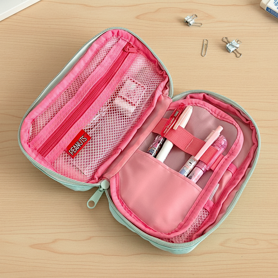Keep your study and work essentials neatly tucked away with this adorable Snoopy pencil pouch! Featuring Snoopy typing out his sweet message, the front pocket pops with pastel aqua and pink, making it as stylish as it is functional. Inside, you’ll find a smart layout with a zipper mesh pocket, a secure elastic band section for pens, and layered compartments for extras like sticky notes, chargers, or even your phone. Portable, colorful, and oh-so-cute—it’s the perfect companion for school, office, or creative adventures.