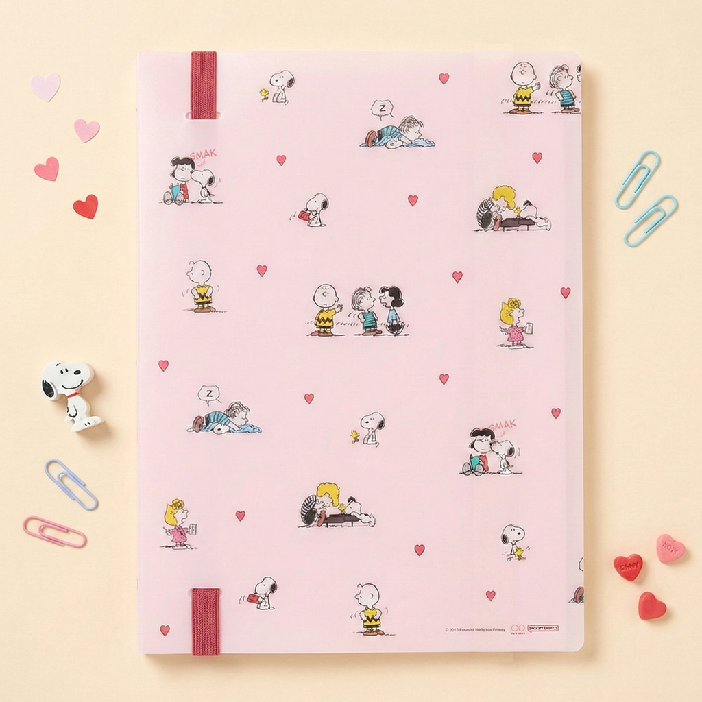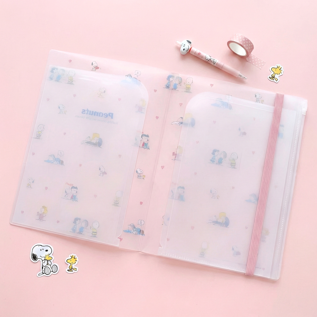 Organize your papers with a touch of sweetness and Peanuts charm! This light pink A4 clear book by Sun-Star Japan is covered in adorable Snoopy and friends scenes that celebrate friendship and fun. Featuring 5 double-sided clear pockets, a bonus zipper pocket, and a glittery pink elastic band, this folder keeps your documents tidy and your heart happy. πΈπ