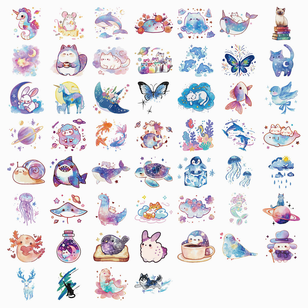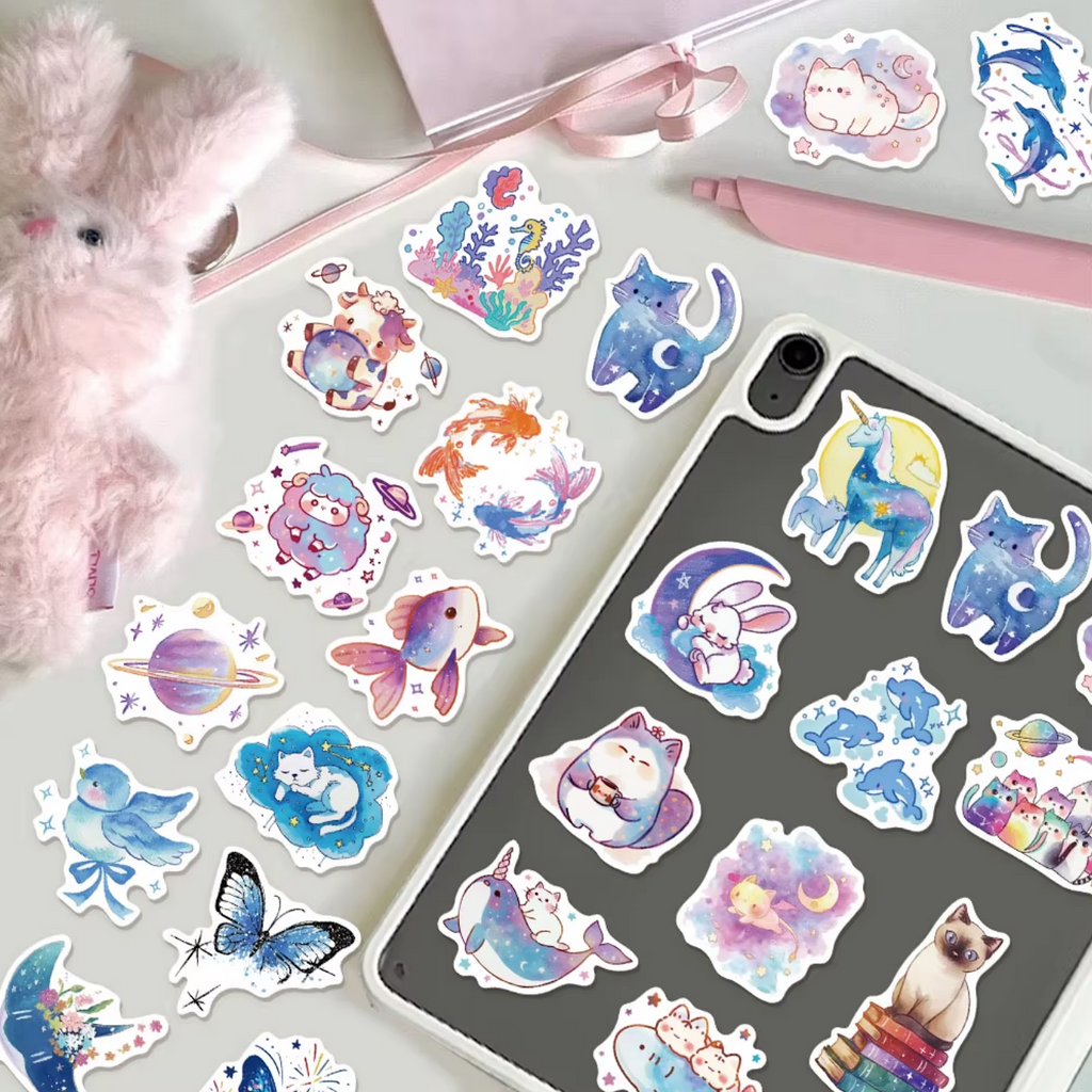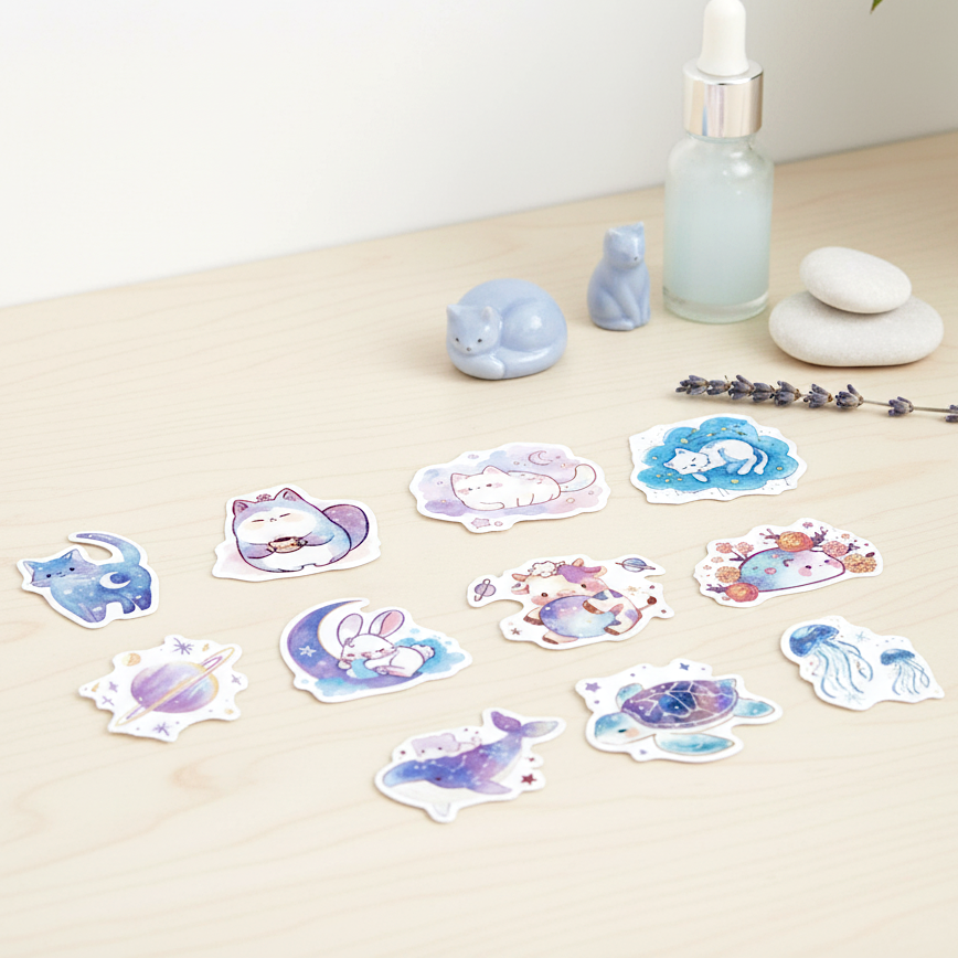 Drift away into a world of sparkling starlight and adorable creatures with the Galaxies Far Away Sticker Pack. This enchanting collection features 53 unique, whimsical PVC stickers blending cute animals with dreamy watercolor space aesthetics. From a bunny napping on a crescent moon to a cat sipping coffee under a nebula, these waterproof decals bring a splash of pastel magic to any surface. Perfect for decorating your planner, laptop, water bottle, or journal!