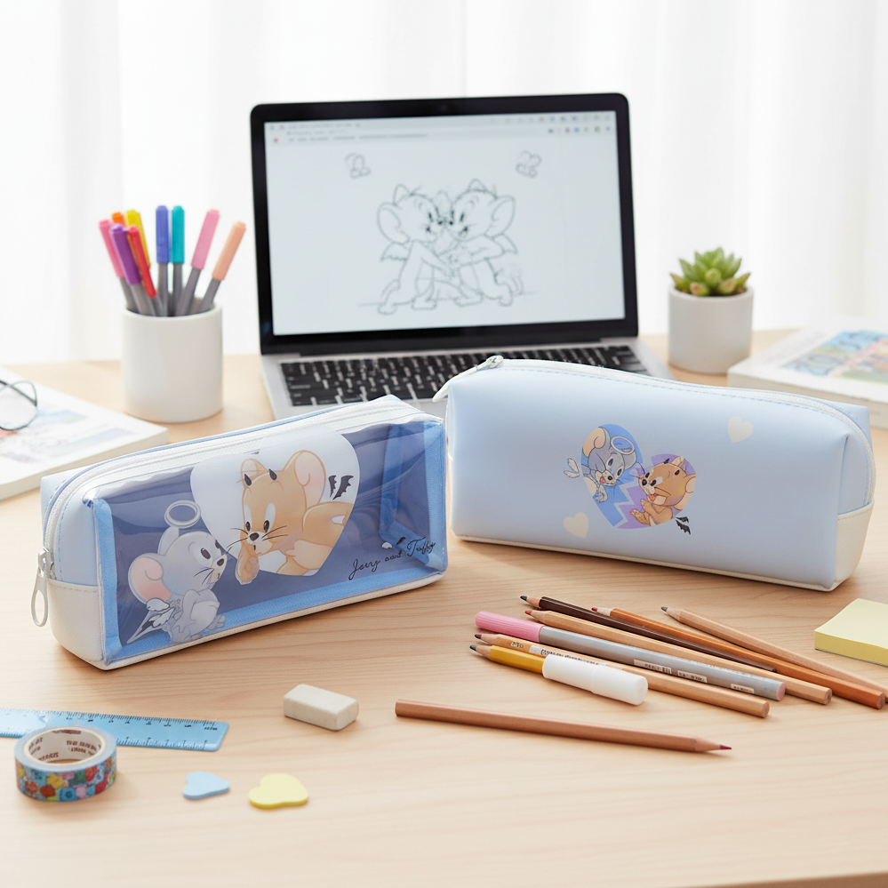 This mischievously cute pencil pouch stars Jerry and Tuffy in their ultimate good-vs-evil form—angel wings vs. devil horns! With a clear PVC front and soft pastel blue design, it’s roomy enough for all your stationery essentials while staying lightweight and portable. Flip it over to see the full heart-breaking duo on the back! 🖊️💘