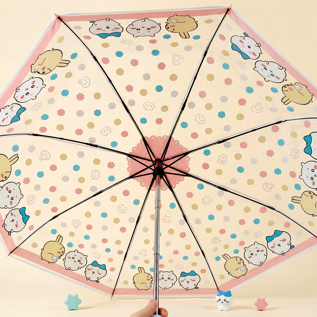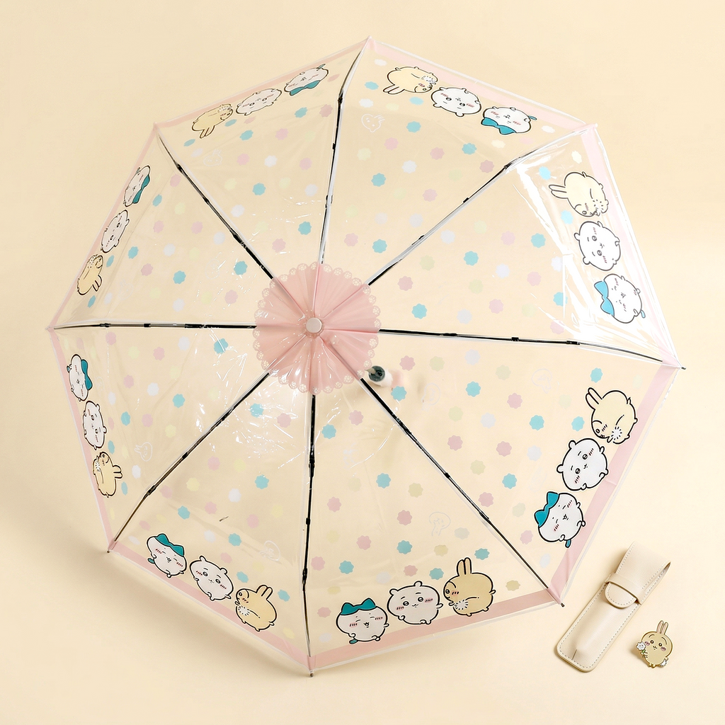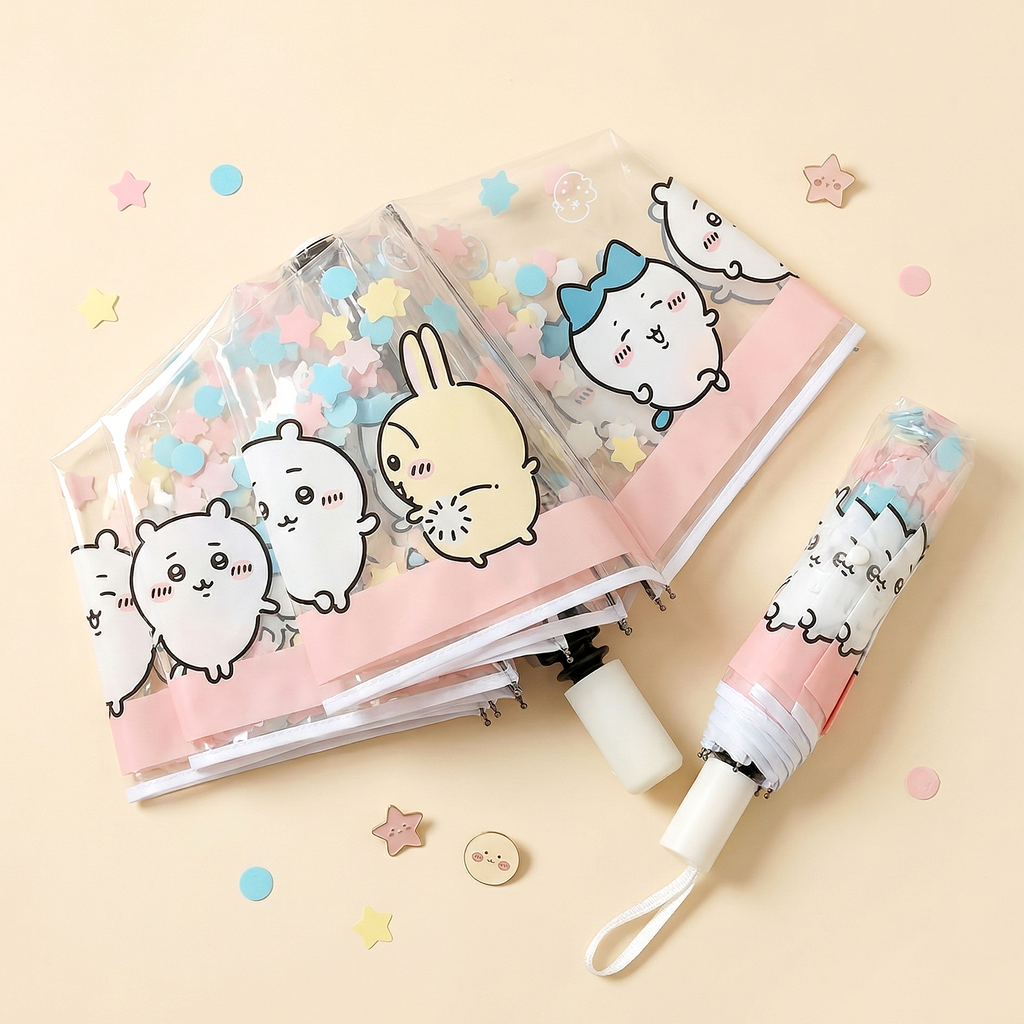 Brighten up the gloomiest of rainy days with the adorable Chiikawa Transparent Umbrella, featuring your favorite round friends dancing happily across a clear, star-speckled canopy. This lightweight, compact accessory allows you to stay cozy and dry while enjoying a perfectly clear view of the dreamy world around you.