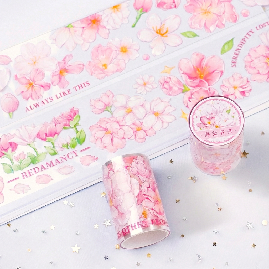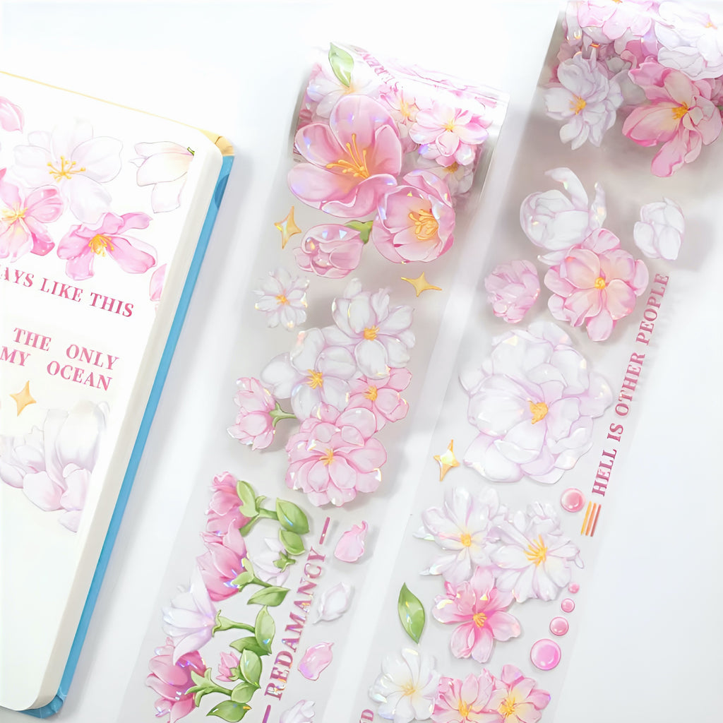 Embrace the magic of cherry blossoms and starlight with this stunning Extra Wide Holographic Sakura Masking Tape! Adorned with shimmering foil details, soft pink and white sakura blooms, delicate leaves, and dreamy quotes, this tape turns every project into a celestial garden of inspiration. Whether you're journaling, scrapbooking, or decorating, it’s your new go-to for a magical touch.