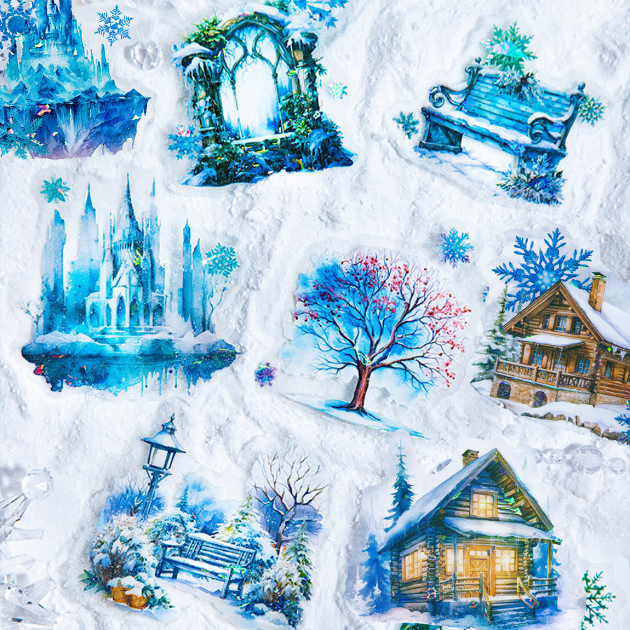 Step into a world of sparkle and snow with the Frosted Fantasy Landscapes Holo Stickers! ✨ From cozy cabins and fairytale castles to frosted trees and snowy windows, each sticker captures the serene magic of winter. Accented with holographic foil that shimmers in the light, these dreamy designs bring a glistening charm to any journal or craft project! 💫