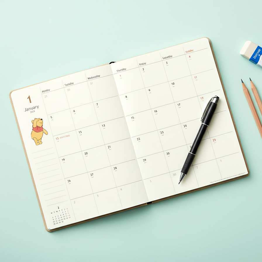 Make every plan feel a little sweeter with this Winnie the Pooh 2026 Schedule Book! The lavender cover features Pooh and Piglet sitting together in a tender sketch-style illustration, bringing a nostalgic charm to your daily planning. Inside, you’ll find both monthly and weekly layouts, each paired with plenty of note space and whimsical character art throughout. With the addition of the Rokuyō calendar, you can enjoy daily fortune insights alongside your plans. A transparent PVC cover keeps it safe and sturdy, making it perfect for school, work, or life on the go.