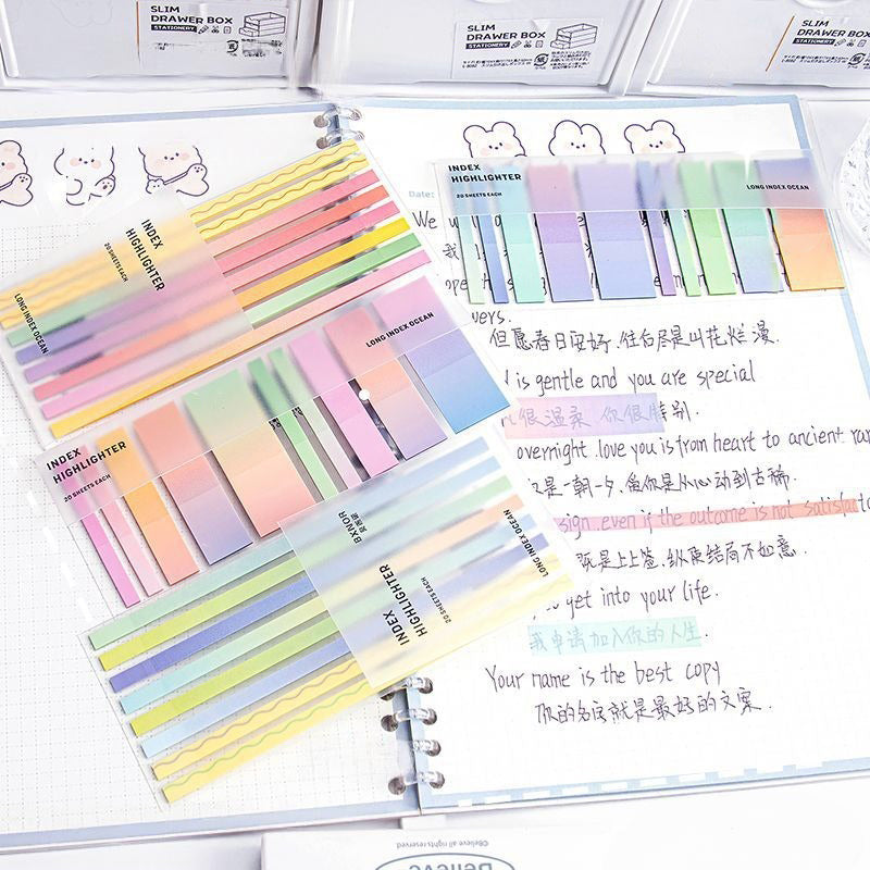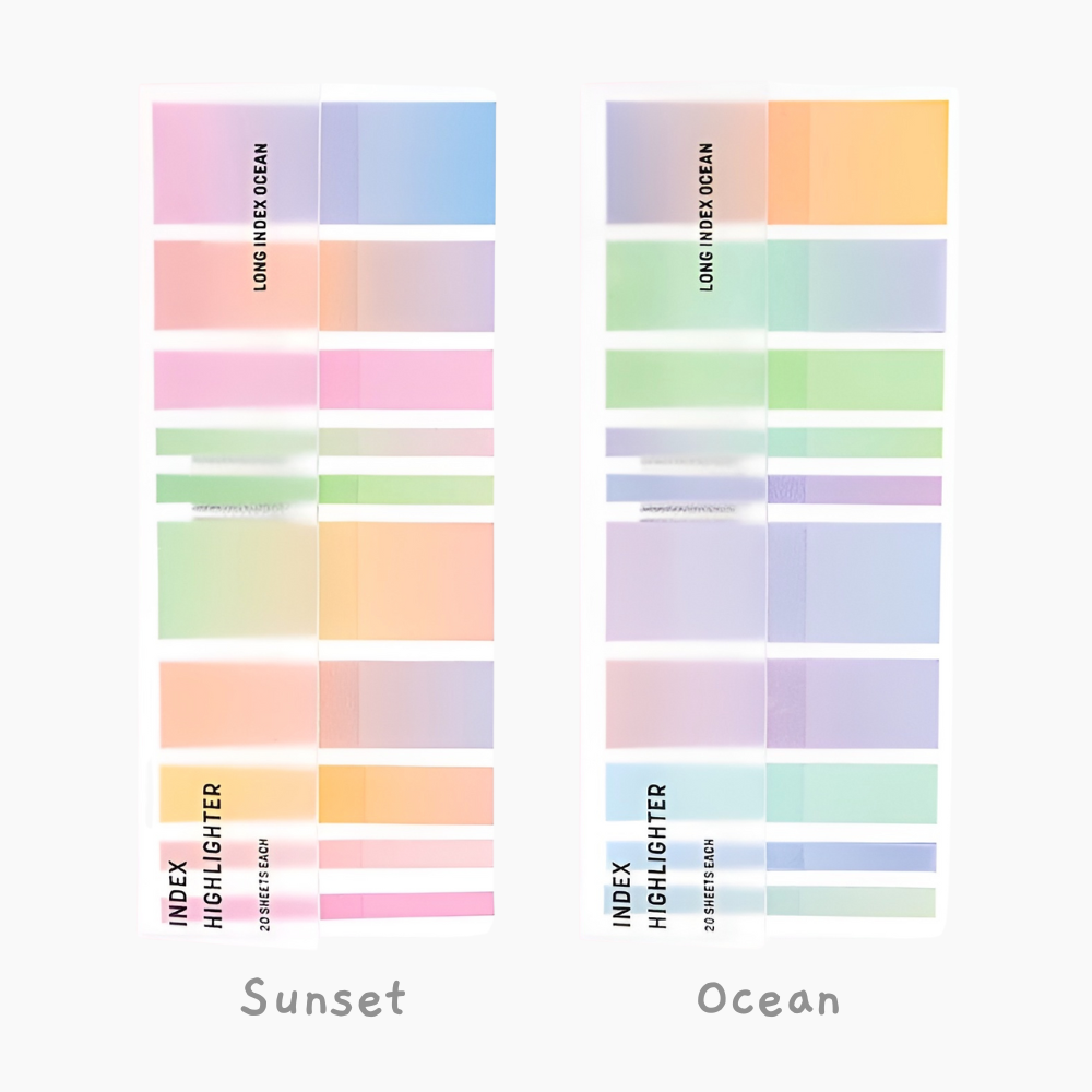 Highlight, organize, and color your notes the smart way with these Iconic Index Short Highlighter Sticky Notes! Made from translucent PET material, they mimic the look of a soft highlighter but can be repositioned anytime — no smudges, no paper damage, just pastel perfection. Choose between the Sunset or Ocean set, each featuring a dreamy gradient palette in three widths for flexible use. Perfect for students, readers, and anyone who loves neat, colorful notes. 💕