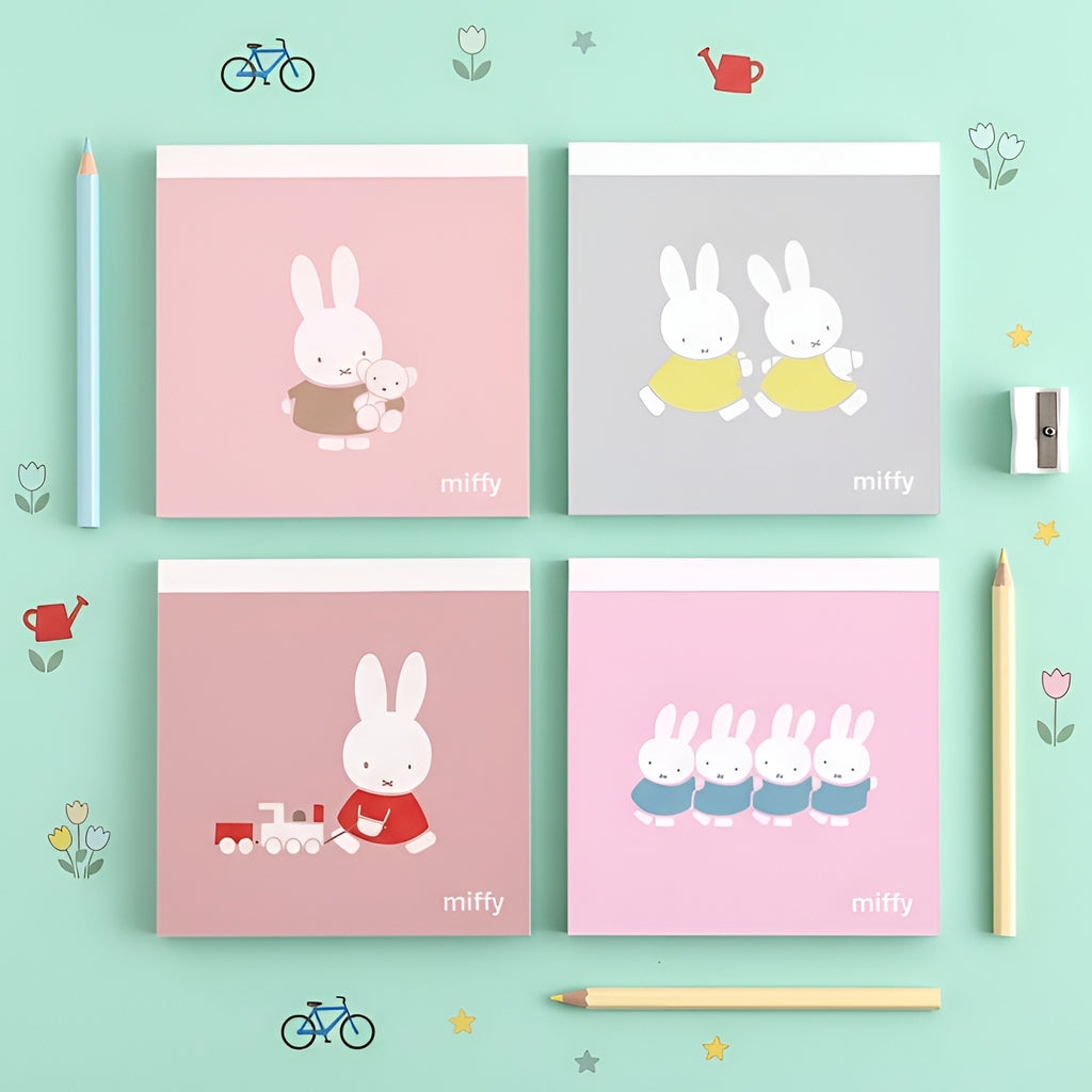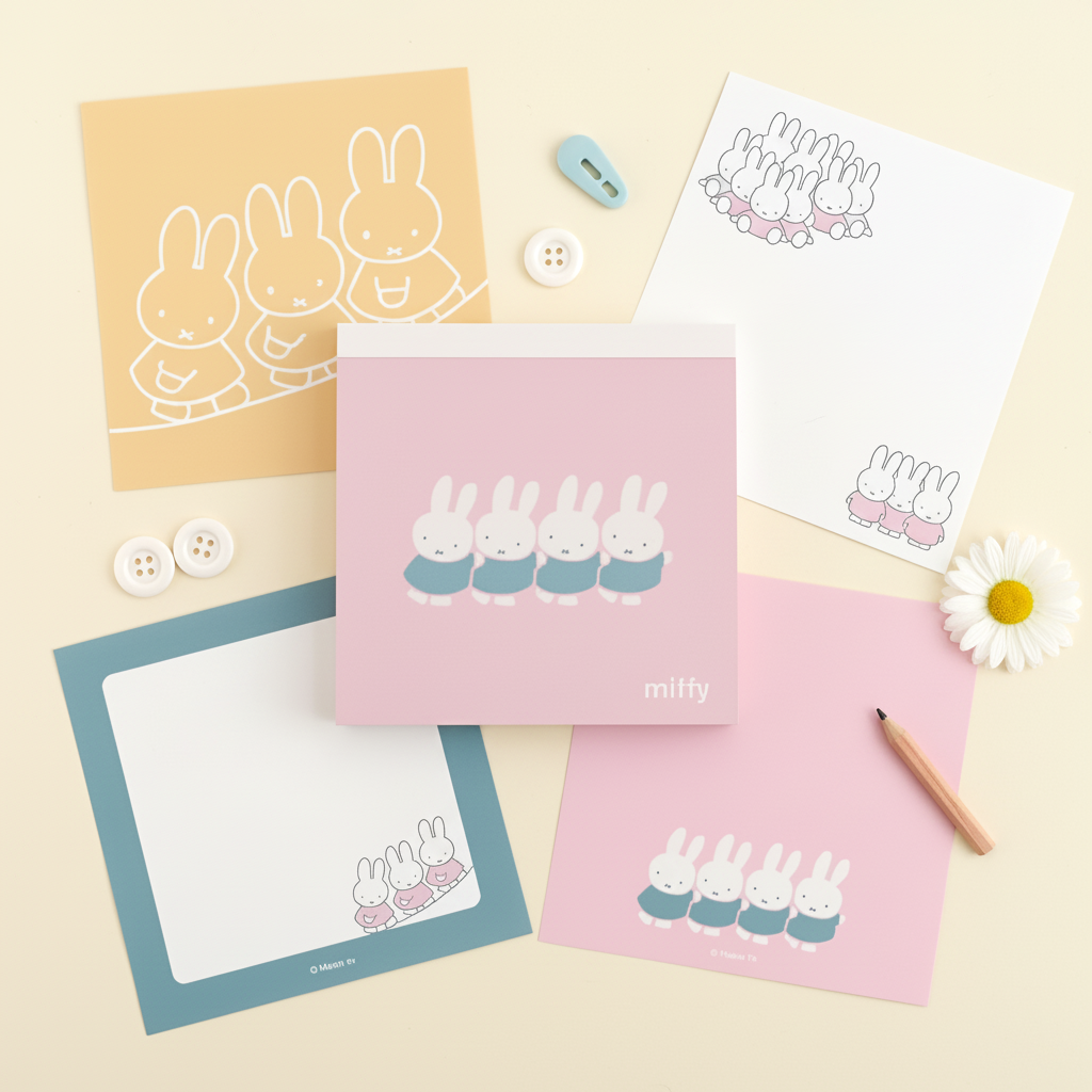 Make every message and quick note adorable with the Miffy Square Memo Pad! This sweet, chunky notepad is a must-have for Miffy collectors and stationery lovers alike. Each pad contains a generous 100 sheets and features four unique, charming Miffy designs in soft, cheerful colors. Measuring a perfect 10 cm, it's the ideal size for your desk, planner pocket, or for writing lovely little messages for friends. It even comes with a clear, protective PVC cover to keep the designs pristine!