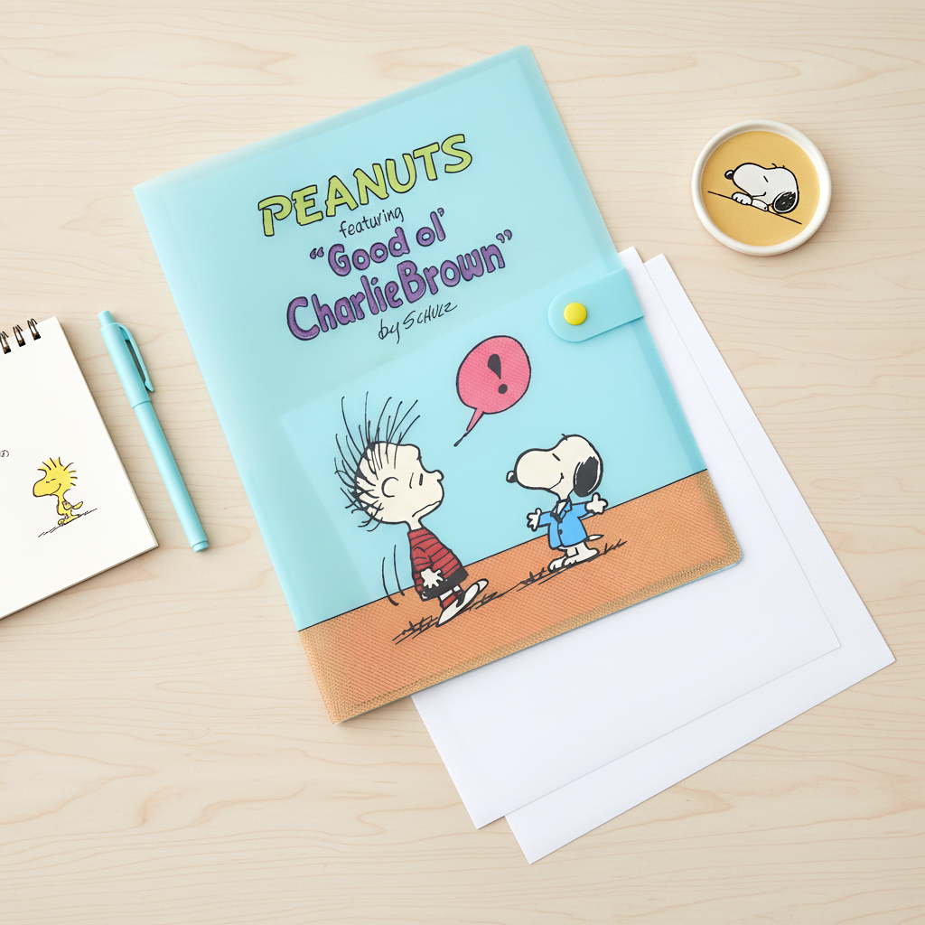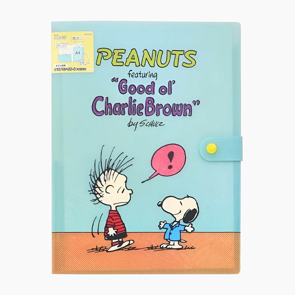 Keep your documents neatly organized and protected with the charming Peanuts Snoopy A4 Folder in Blue! This bright organizer features a cheerful, translucent light blue color and is adorned with classic comic strip vignettes featuring Snoopy and Charlie Brown's hilarious antics. Made from durable, waterproof PP material, this folder provides excellent organization with a total of four internal pockets (one large open pocket and three dedicated file pockets). The reliable snap-button closure ensures your important A4 papers stay secure inside!