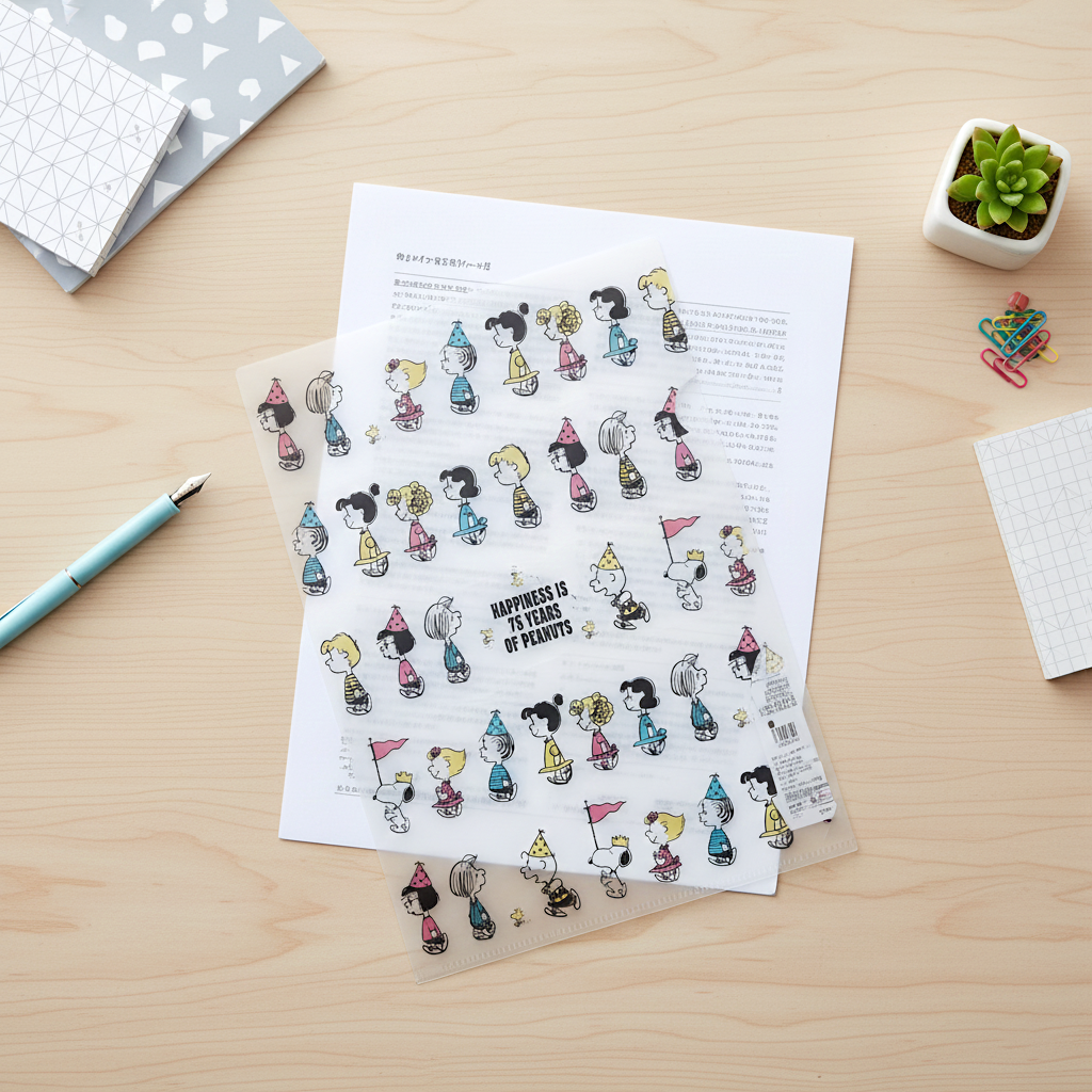 Keep your documents safe and organized with the joyous Peanuts Snoopy A5 Folder - Happy March Limited 75th Anniversary Edition! This collectible single-pocket folder features the entire Peanuts gang—including Charlie Brown, Lucy, Linus, and Snoopy—marching happily in colorful rows, celebrating the 75th milestone. The center proudly proclaims: "Happiness is 75 Years of Peanuts!" Made from durable, waterproof PVC, this A4 folder is perfect for protecting important papers in your backpack or desk while showcasing a cheerful piece of Peanuts history.