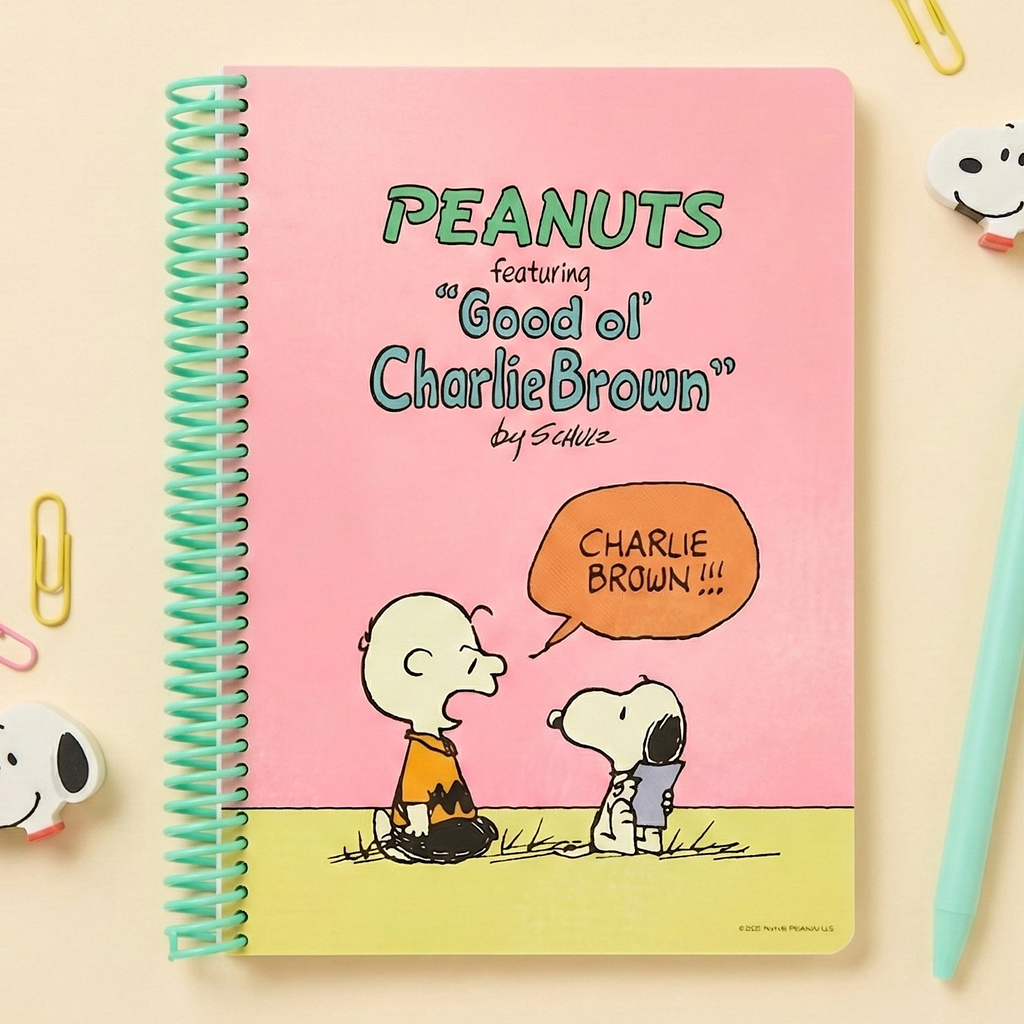 Step into the delightful world of Peanuts with this adorable Snoopy B6 Spiral Notebook! This ring-bound journal features a charming pink cover showcasing the classic dynamic between Charlie Brown and Snoopy, capturing the humor and heart of the beloved comic strip. Its compact B6 size is perfectly portable for tossing into a bag, while the internal grid pages offer ideal versatility for notetaking, bullet journaling, diagramming, and even sketching. It's the perfect way to bring a little nostalgic joy to your school, work, or daily planning! βοΈ