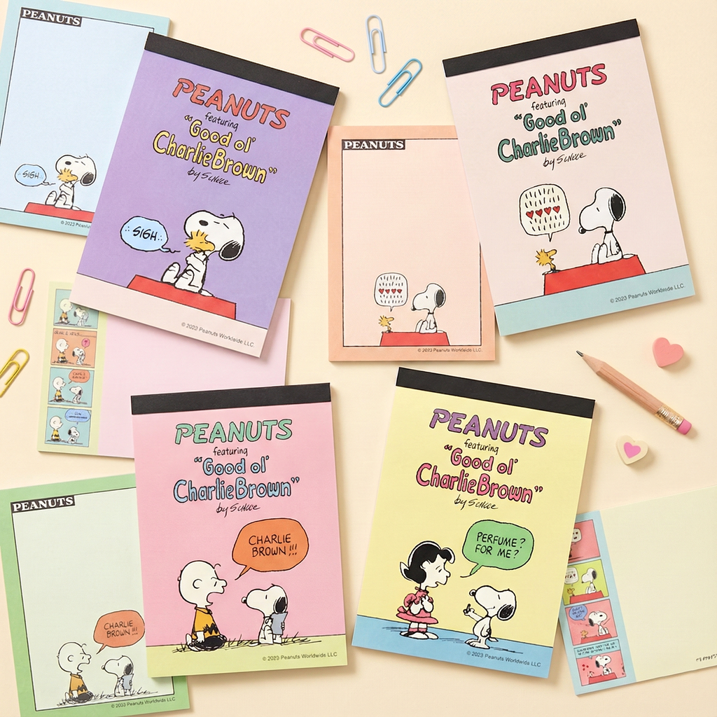Keep your thoughts tidy and your spirits bright with the Peanuts Snoopy Memo Pads! These mini, portable notepads are perfect for quick notes, to-do lists, grocery reminders, and small messages. Each pad features a soft pastel cover (choose from 4 vibrant colors!) and contains 80 sheets, split into two distinct page designsβa vertical layout and a horizontal layout. Adorned with humorous comic vignettes of Snoopy, Charlie Brown, and friends, these pads make writing down your quick thoughts an absolute joy!