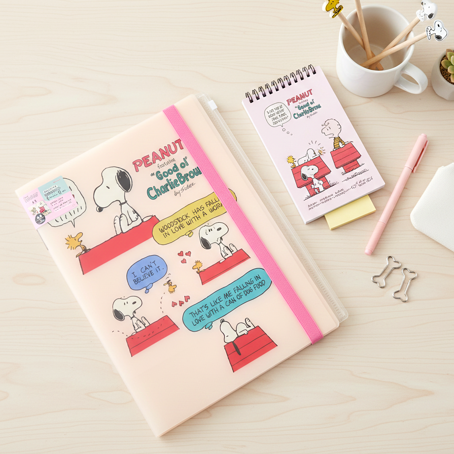 Master your paper clutter with the versatile Sun-Star Peanuts Snoopy Clear Book! This ingenious A4 organizer is the perfect blend of cute design and serious utility. The durable, waterproof PP material features translucent beige pages adorned with classic Snoopy and Woodstock illustrations. Inside, you'll find five separate pockets plus a bonus slide-closure pocket for tiny, important items. The entire book is kept neatly secured by a cheerful, glitter-infused elastic band—ideal for students, artists, and office professionals!