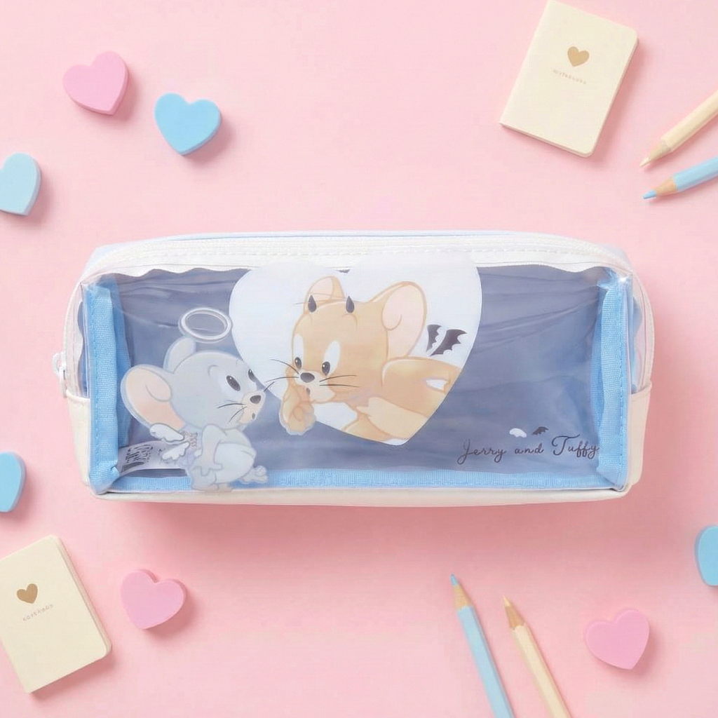This mischievously cute pencil pouch stars Jerry and Tuffy in their ultimate good-vs-evil form—angel wings vs. devil horns! With a clear PVC front and soft pastel blue design, it’s roomy enough for all your stationery essentials while staying lightweight and portable. Flip it over to see the full heart-breaking duo on the back! 🖊️💘